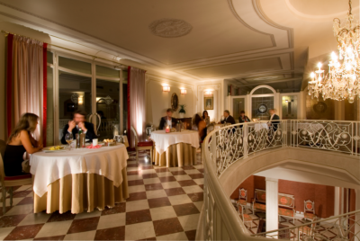 Una doppia scalinata collega esternamente due dei quattro piani della struttura, permettendo di passare dal piano terra dove è situata la reception del relais e l’ingresso del centro benessere, al primo piano dove si trova una splendida terrazza che circonda l’edificio e da dove si può accedere al ristorante.