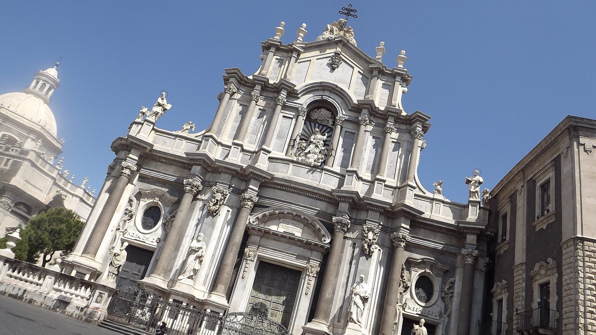 La Cattedrale come abbiamo già detto è situata nel cuore della parte storica della città, su dei resti di un precedente edificio termale (Terme Achilliane) risalenti al II sec d.C.; l’edificio attuale, però, è il risultato di molte trasformazioni avvenute in seguito ai terremoti e alle eruzioni che hanno coinvolto la città di Catania. Dell’impianto originario, risalente al 1094, rimangono solo i muri perimetrali e gli absidi, che appartengono al periodo normanno. Nel 1169, il terremoto che colpì la città, distrusse interamente le volte della chiesa, ma le macerie non furono rimosse, bensì furono usate come base per innalzare il suolo dello stesso edificio. Successivamente, nel 1693, un altro sisma colpì Catania e distrusse quasi tutta la città. Ma tra la fine del ‘700 e gli inizi dell’800, la chiesa fu ricostruita completamente e l’edificio fu dotato della cupola maestosa, con dei grandi finestroni, che tutt’ora riusciamo a scorgere nel profilo del capoluogo etneo. L’edificio odierno è opera dell’architetto Girolamo Palazzotto, mentre la facciata fu disegnata dallo stesso Gian Battista Vaccarini. Il prospetto è composto da 3 ordini di stile corinzio e sono adornati con delle statue di S. Agata, vergine e martire patrona della città di Catania a cui è dedicata la cattedrale. Il portone principale è interamente in legno, costituito da formelle che narrano il martirio della santa, e ai lati troviamo le statue dei Santi Pietro e Paolo.