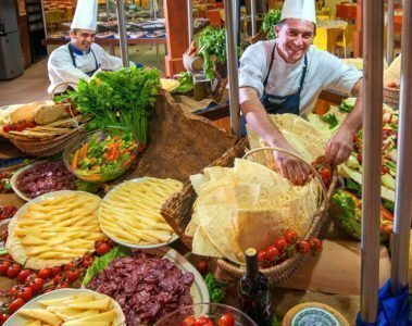 A pranzo e a cena gli chef si esibiscono in showcooking, ultimando i piatti direttamente in sala.