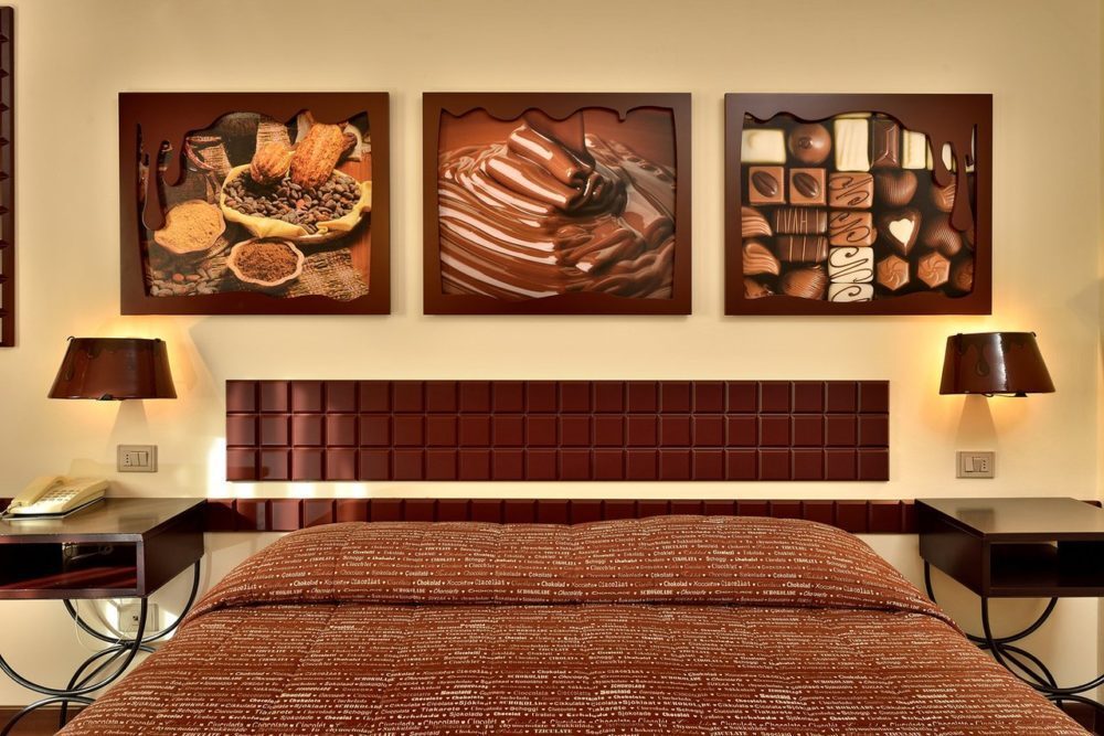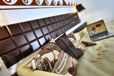 Anche le camere sono caratterizzate da un arredamento a tema; armadi e testate dei letti a forma di tavolette, abat jour con cioccolato colante, chocoscrivanie con la parola “cioccolato” scritta in ogni lingua del mondo, coperte, comodini, quadri e tanti altri dettagli tutti color cioccolato!