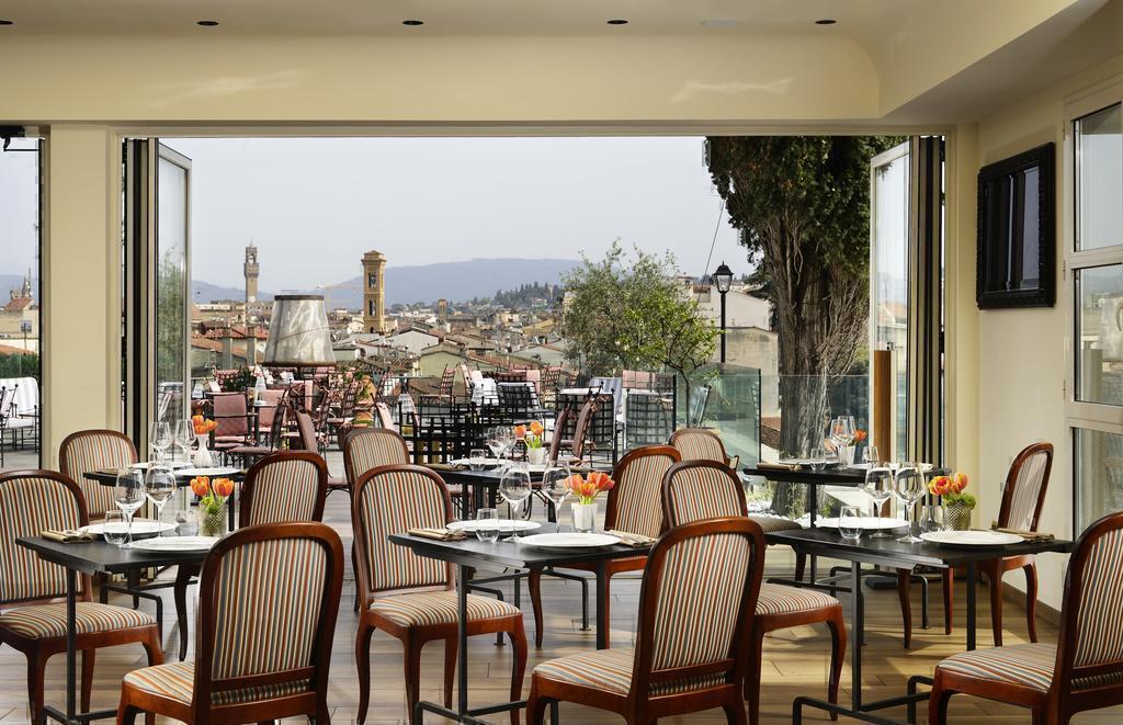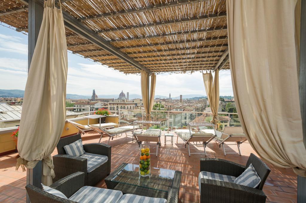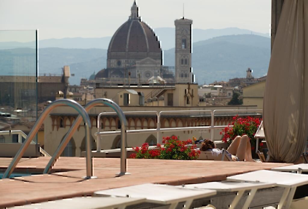 Già nella hall sarete immersi in un’atmosfera calda e accogliente, la struttura abbina perfettamente lo stile classico con elementi più moderni. Affascinante la terrazza panoramica all’ultimo piano, diventa il luogo ideale dove rilassarsi e riposare grazie a lettini e poltrone; essendo al sesto piano la terrazza vi regalerà una vista straordinaria sulla cupola di Brunelleschi, campanile di Giotto, torre di Palazzo Vecchio e sulle colline di Firenze, non ve la scorderete di sicuro! Troverete inoltre la piscina (aperta anche in inverno), un giardino pensile con pini, cipressi e olivi, il ristorante (Terrazza Rossini) e l’american bar.