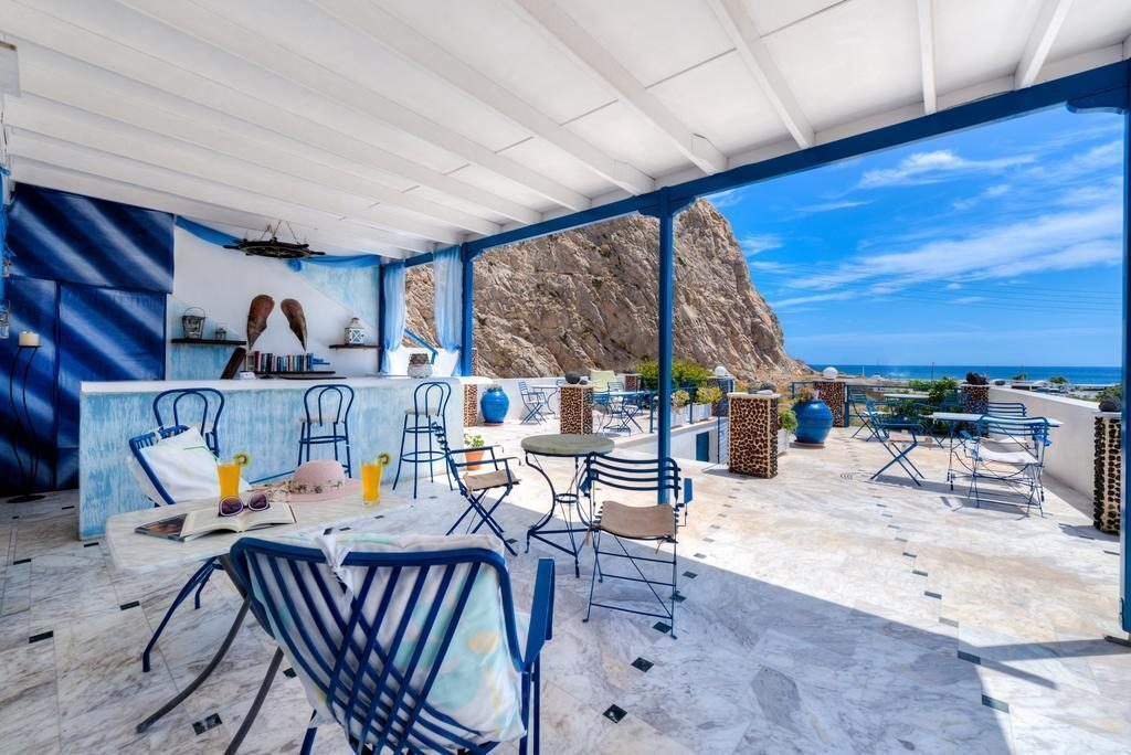Il Bed&Breakfast affaccia sul versante orientale di Thirasia. Anch esso ricalca lo stile delle Cicladi. La struttura infatti è caratterizzata da bianche mura, e da un pizzico di blu. La terrazza coperta con balaustra, anch’essa blu, affaccia sulla baia interna dell’isola.