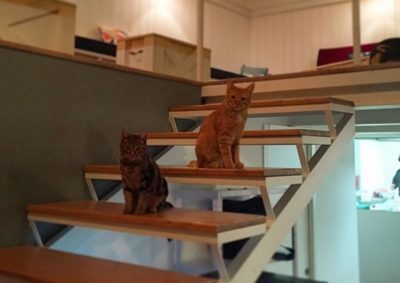 Libri e cassetti che sembrano fluttuare e appoggiarsi alle pareti senza uno scopo apparente, in realtà formano delle simpatiche scale che permettono ai mici di salire e godersi la vista dall’alto o seguire il percorso tutt’attorno alla sala, fino ad incontrare un bellissimo ramo d’albero, perfetto per l’arrampicata! Valigie, poltroncine, cuscini e tiragraffi sono abilmente integrati in ogni angolino per il benessere dei padroni di casa.