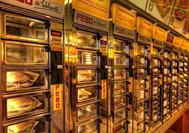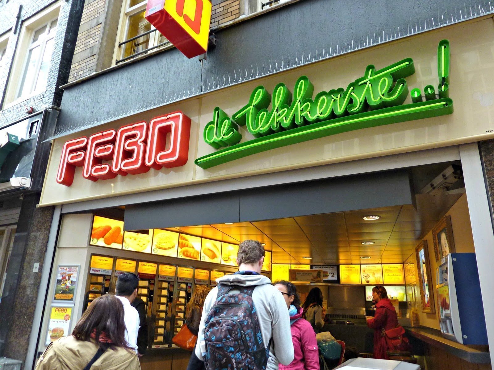 Chiedersi cosa mangiare ad Amsterdam non da grandi risposte a palati italiani molto esigenti, ma in cerca di uno street food che sia anche lowcost e accompagni il turismo in modo sfizioso, anche se non proprio salutare, Febo è la risposta giusta ai tanti fastfood più noti di catene commerciali che invadono la città. Le croquettes soddisfano la curiosità di qualcosa da mangiare in stile olandese , incuriosiscono per l’idea di dover scegliere il proprio snack in un grande distributore automatico fatto di piccoli fornetti e divertono all’idea di un cibo veloce e fai da te pronto con una sola monetina.
