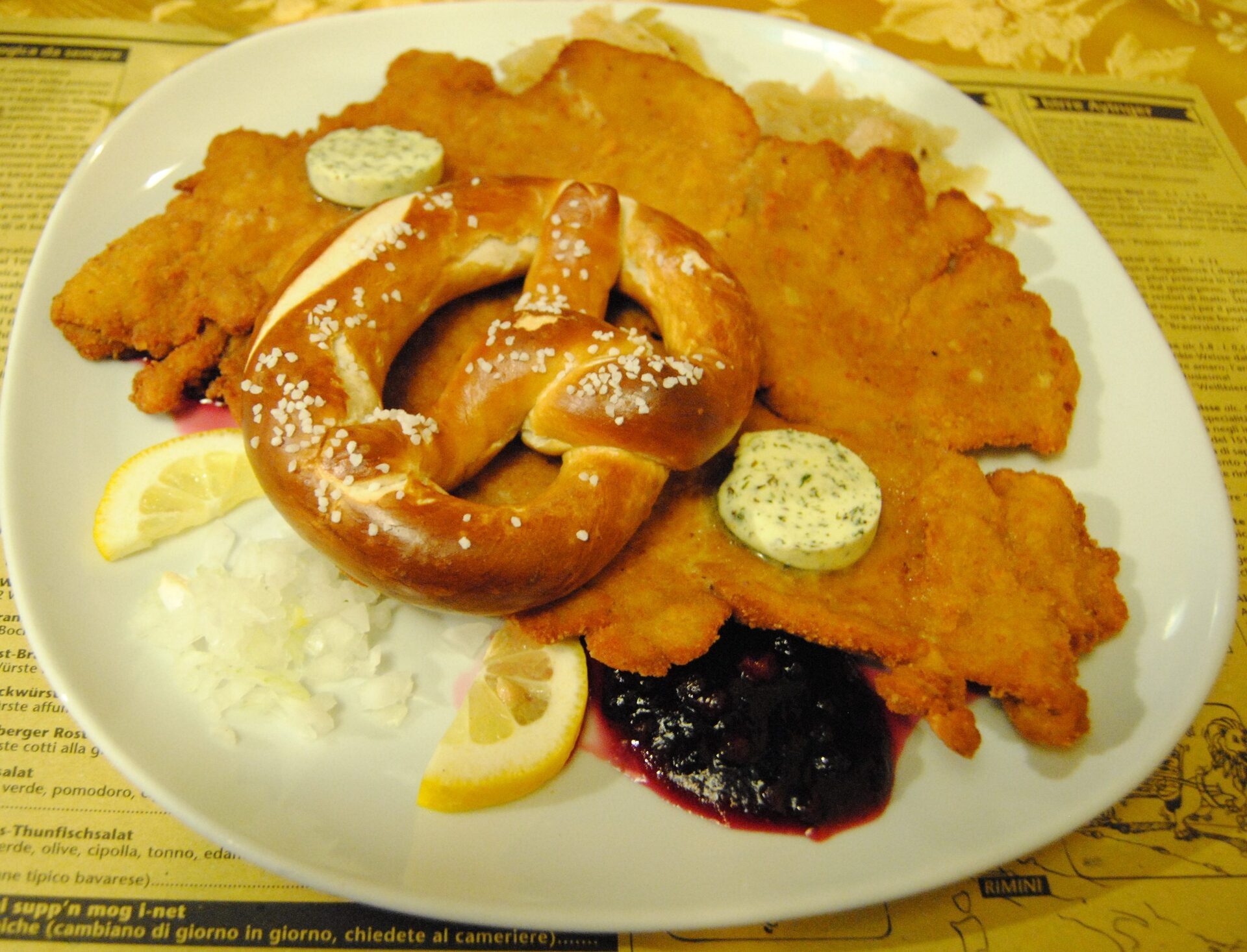 Ordino così un Lowenriesenschnitzel, ovvero cotoletta impanata con salsa di mirtilli, burro aromatizzato alle erbe, crauti ed un brez’n ed un boccale di Altbairisch dunkel, una specialità di birra bavarese scura veramente piacevole e corposa. Ammetto che me ne sarei degustate anche altre, ma vista l’ora, mi riprometto di ripassarci quanto prima.