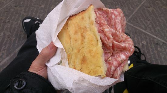 Oltre ai panini già pronti, ognuno può scegliere di farsi preparare il suo panino con il tipo di pane e gli ingredienti che preferisce. Si può scegliere tra la schiacciata Fiorentina, molto saporita, oppure il pane casereccio toscano. I panini sono molto abbondanti e posso garantire che uno solo è più che sufficiente.