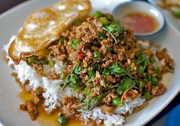 Gli amanti della carne andranno in brodo di giuggiole per il Pad Kra Pao Gai, un piatto a base di pollo tagliato in piccoli pezzi e insaporito con il basilico thailandese che, rispetto al nostro, ricorda il limone. Il tutto viene poi fatto saltare nel wok e solitamente servito in un ampio piatto e accompagnato da una montagnetta di riso glutinoso e un uovo al tegamino di lato. Decisamente abbondante, non credo che dopo riuscirete ad assaggiare molto altro. È fondamentale saper usare le bacchette.