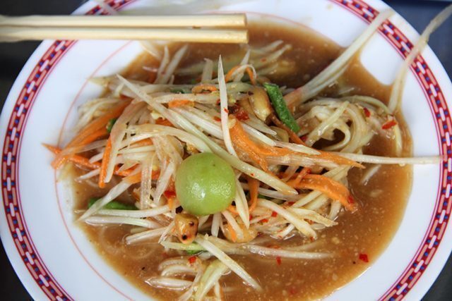 Ovvero la Papaya Salad: potrete ammirare la grande mestria e manualità dei cuochi che pesteranno in un mortaio la papaya con aglio, zucchero, chili, fagiolini, pomodorini, gamberetti e voilà! Avrete la vostra insalata con sapori sapientemente mischiati. Aggiungono ai vari ingredienti una salsa a base di pesce. Ho chiesto alla venditrice di mostramela e alla fine l’ho anche comprata, ma confesso: non l’ho mai usata. Questa con i gamberetti è la variante che ho assaggiato io, ma potrete anche trovarla con pesce fermentato o con il granchio. È uno dei piatti più diffusi nel paese e solitamente lo si accompagna con del riso glutinoso.