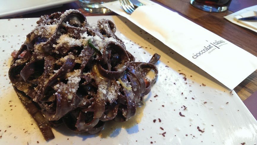 Inoltre Cioccolati Italiani non è proprio come pensavo io, non è solo cioccolateria e gelateria, ma tanto altro. Cioccolati Italiani è ristorante e brunch, spesso mixando le due cose. Si possono ordinare da menù hamburger insalate e primi, ma anche primi al cioccolato, come in questo caso le ottime tagliatelle al cioccolato.