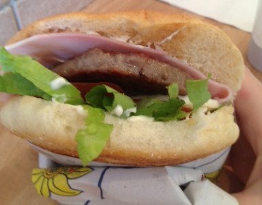 Dicevo, ci sono gli hamburger e i cheeseburger e tutti i panini classici che non hanno nomi e poi ci sono dei panini farciti da loro che hanno i nomi dei supereroi, sì avete capito bene. Quindi c’è Batman, Wonder Woman, Zorro e tanti altri :D Quello nella foto è un hamburger con mozzarella e prosciutto cotto, una cosa un po’ strana, ma credetemi assolutamente buona. Il bello è che un panino così vi lascia estremamente soddisfatti. Bibita e panino a 5€.