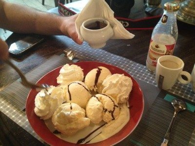 I due proprietari, probabilmente anche compagni visti i gesti di effusione, sono carinissimi, soprattutto il signore che viene a prendere le ordinazioni. Dopo un caffè con latte acido ci siamo concessi un gelato alla vaniglia con panna montata e cioccolato fuso. A dir la verità il gelato non è niente di che anche se il caffè è ottimo (soprattutto se non mettete il latte acido).
