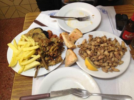 Ieri abbiamo cenato con: calamari, sardine e sgombro alla piastra, carciofi fritti e pan con tomate (più un bicchiere di vino, acqua e gassosa) per 10 euro a testa.