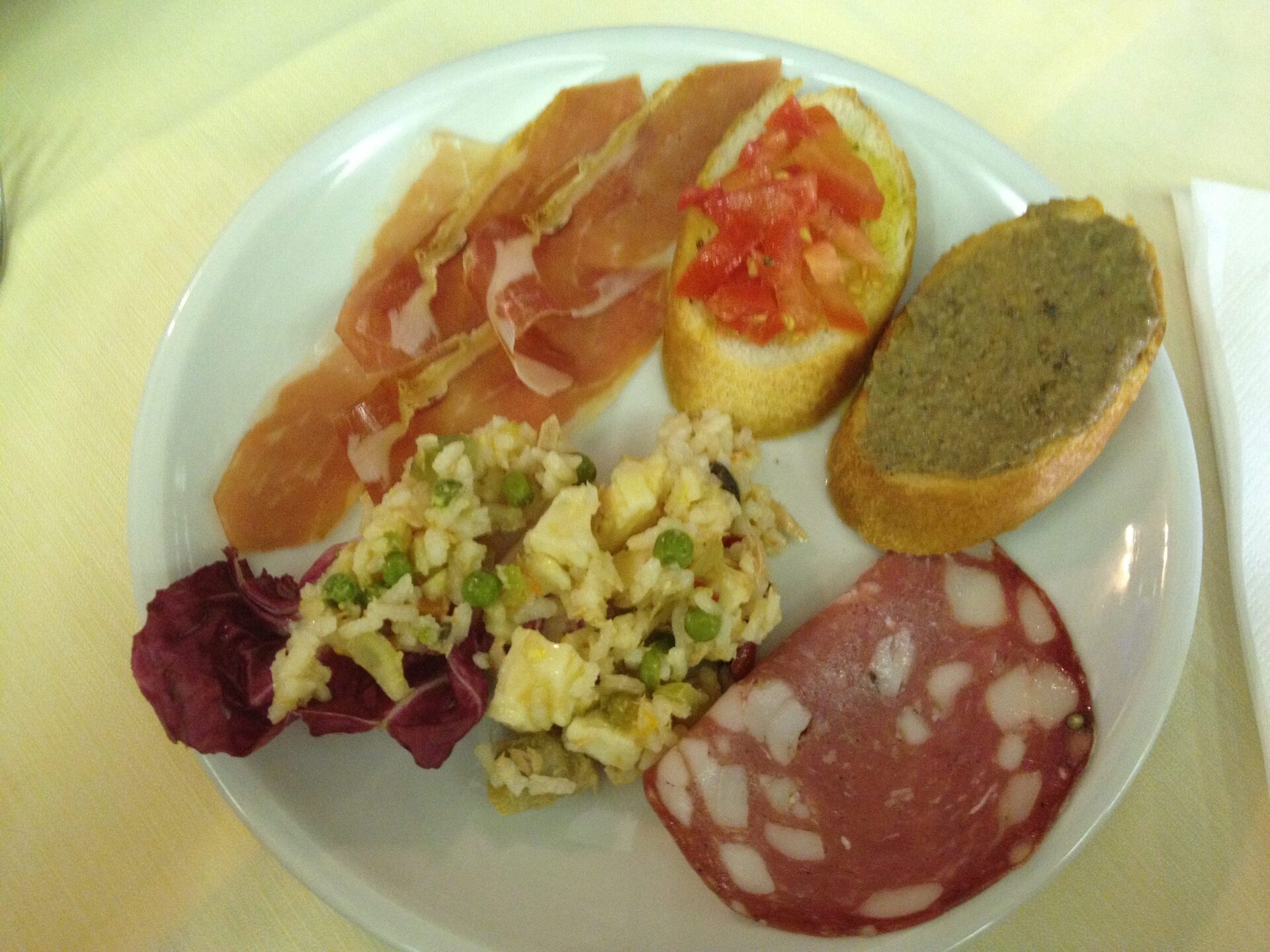 L’antipasto che vi porteranno è questo qui sopra. Nulla di troppo elaborato, quella roba bianchetta è un’insalata di riso nemmeno troppo buona. Ho lasciato la metà di tutto nel piatto. Buono invece il primo, delle penne con melanzane e altre verdure. Infine una macedonia per finire il menù che non ho preso perché non mi andava.