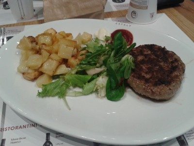 Un nostro caro amico, Giuseppe di Eurotrip, è andato a mangiare a Eataly a Roma e ci ha consigliato caldamente il posto. Lui ha preso un hamburger con patate, come si vede nella foto ed è rimasto decisamente soddisfatto.