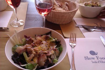 Cosa mi sono mangiata? Tutto ^_^ Scherzi a parte io ho mangiato l’insalata che vedete sopra, fatta di: fogli di insalata, zucchine, pinoli, finocchio e pesce lasciato in olio e limone per qualche ora. Buonissima. Vino rosato, pane e un dolce di pesche lasciate a macerare per circa un giorno nell’Aleatico, uno dei vini passiti migliori in Italia. Davvero un pranzo gustosissimo e se vogliamo leggero. Da provare assolutamente anche per l’atmosfera, il vino e i libri, in ogni dove ^_^