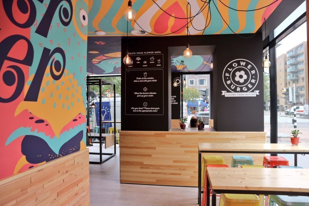 Personalmente mi ha molto colpita l’interno dei Flower Burger. Io ho visto lo store di Rotterdam, che si trova in Hoogstraat 107A, ma essendo un franchising gli interni sono tutti uguali. Un arredo moderno, tantissimi colori, sedute non ingombranti e anche lunghi tavoli da condividere. Il servizio non è al tavolo, si ordina alla cassa e poi si torna a prendere il proprio hamburger una volta pronto. Ci si può servire da soli con le bevande, tutte rigorosamente italiane (anche a Rotterdam, con la sola eccezione di una birra e un succo di mela locale – provato da me). Dietro il bancone si trova una tenda anni ’70 e poi la cucina che si intravede poco dietro.