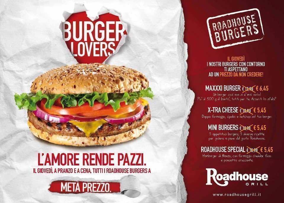 Tutti i giovedì da RoadHouseGrill tutti gli hamburger sono a metà prezzo, sia a pranzo che a cena. La carne è di qualità e grandissima è la varietà di hamburger e soprattutto i panini sono giganti! Pochi euro e avrete veramente un pasto completo e gustoso.