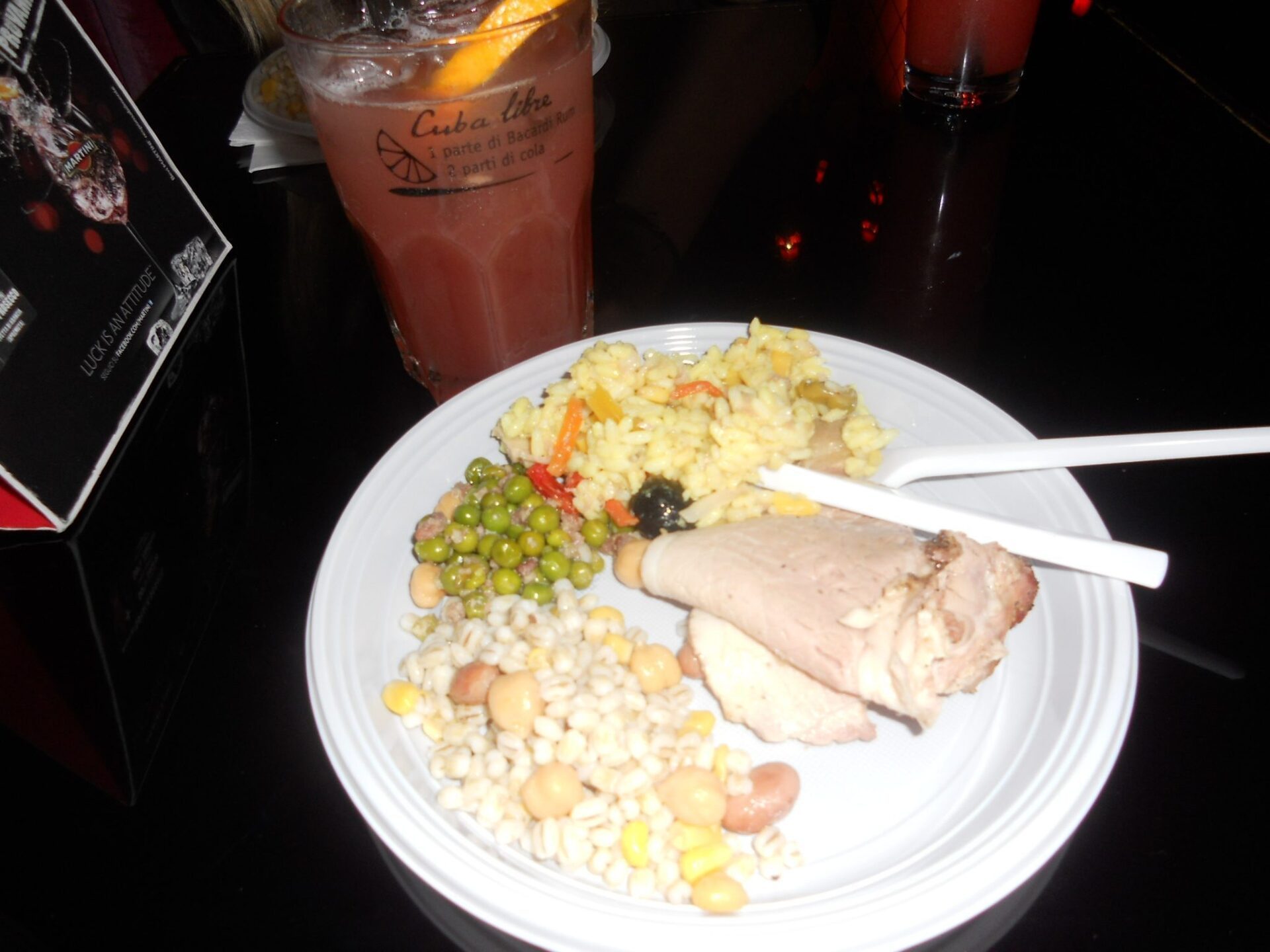 Il costo dell’aperitivo è di 8.50€ e comprende bevuta e buffet. La bevuta si sceglie tra un bicchiere di vino, un cocktail alcolico o analcolico. Il buffet è abbondante ed include opzioni vegetariane. La formula è all you can eat, quindi potete riempire più volte il vostro piatto con diversi tipi di antipasti, pasta, carne, contorni.