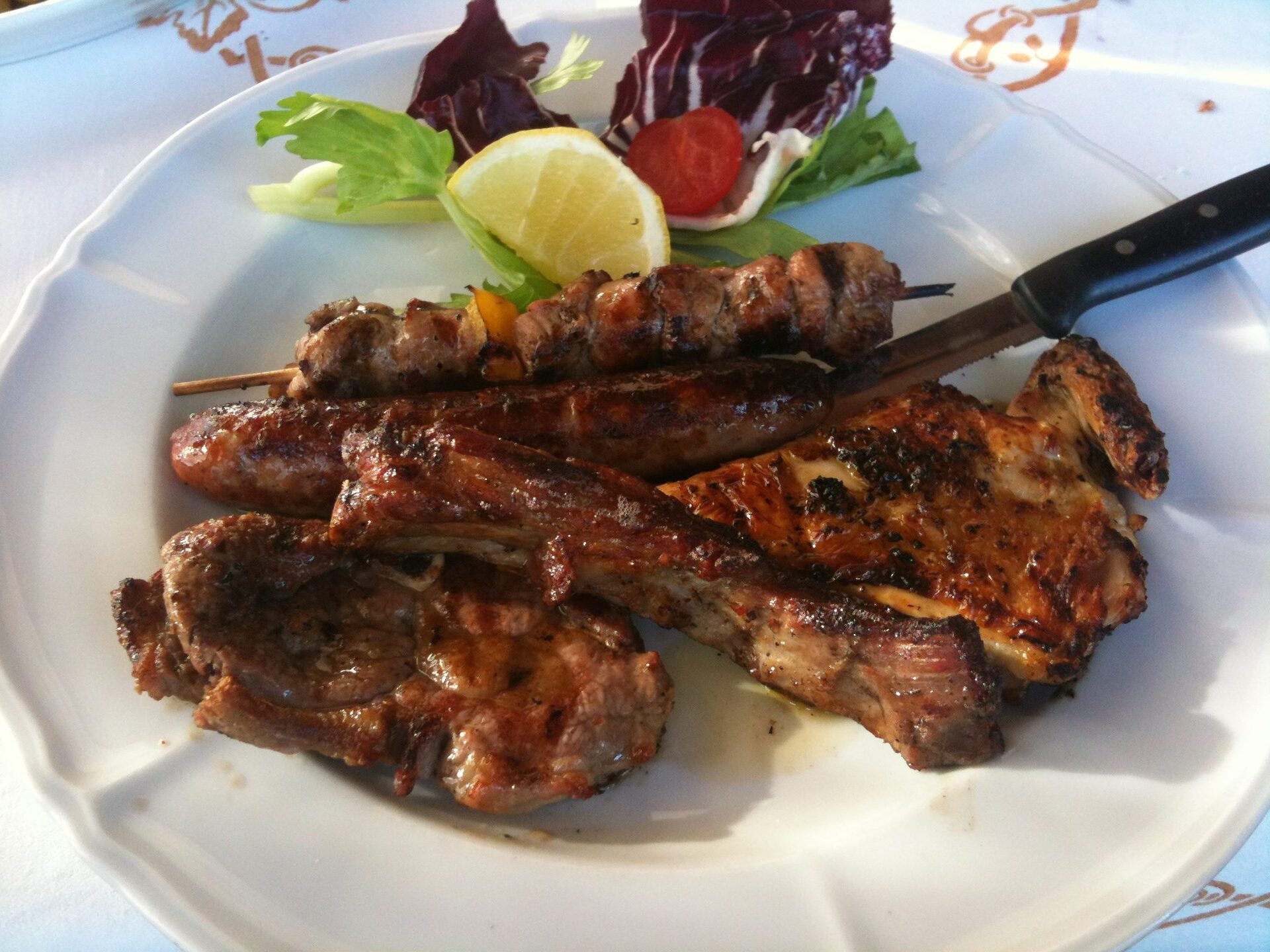 Il personale è più che accogliente e complice la splendida giornata, le ampie vetrate, il tavolo ben posizionato mi sentivo come a casa. La pasta è rigorosamente fatta in casa e la piadina in accompagnamento non mancherà mai. Solitamente la devo chiedere, ma qui ad ogni portata ne arrivava a stufo. Potevamo tranquillamente scegliere la pizza oppure il menù Magna Romagna e con soli 17 euro (minimo due persone) avrei potuto mangiare un piatto assortito di salumi, squaquerone (formaggio molle) e pecorino, contorni gratinati e grigliati, insalata, piadina a volontà, sorbetto e ciambella. Ho scelto però di andare alla carta spendendo qualcosina di più, ma a conti fatti i piatti erano abbondanti e ben cucinati. Una tagliatella al dente con il ragù, una grigliata abbondante, mezzo galletto alla diavola, contorno di patate al forno, piadina ben calda, un quarto di sangiovese. Il dolce mi ha ricordato l’infanzia: pere e susine cotte nel vino con cannella e chiodi di garofano. Sublime. Ve lo consiglio.