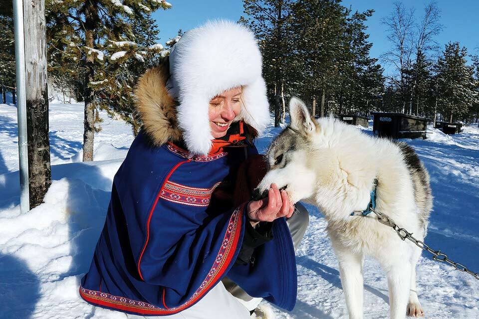 I Sámi ci stanno aspettando: donne, uomini e bambini con gli abiti tradizionali nei colori blu, giallo, rosso e verde, gli stessi della bandiera, formata da un cerchio rosso che simboleggia il sole su uno sfondo blu.