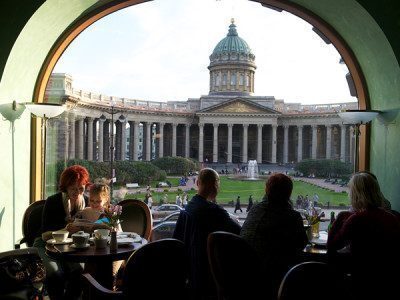 E se sarete fortunati a trovare un tavolo libero davanti alle vetrate, potrete sorseggiare il vostro thè sbirciando la vita che scorre lungo la strada o l’architettura della cattedrale di Kazan, una Basilica di San Pietro in miniatura col colonnato e la cupola e la grande piazza a fare da ingresso. I prezzi del bar sono abbastanza alti, sia rispetto agli standard pietroburghesi che a quelli europei, ma ne vale assolutamente la pena.