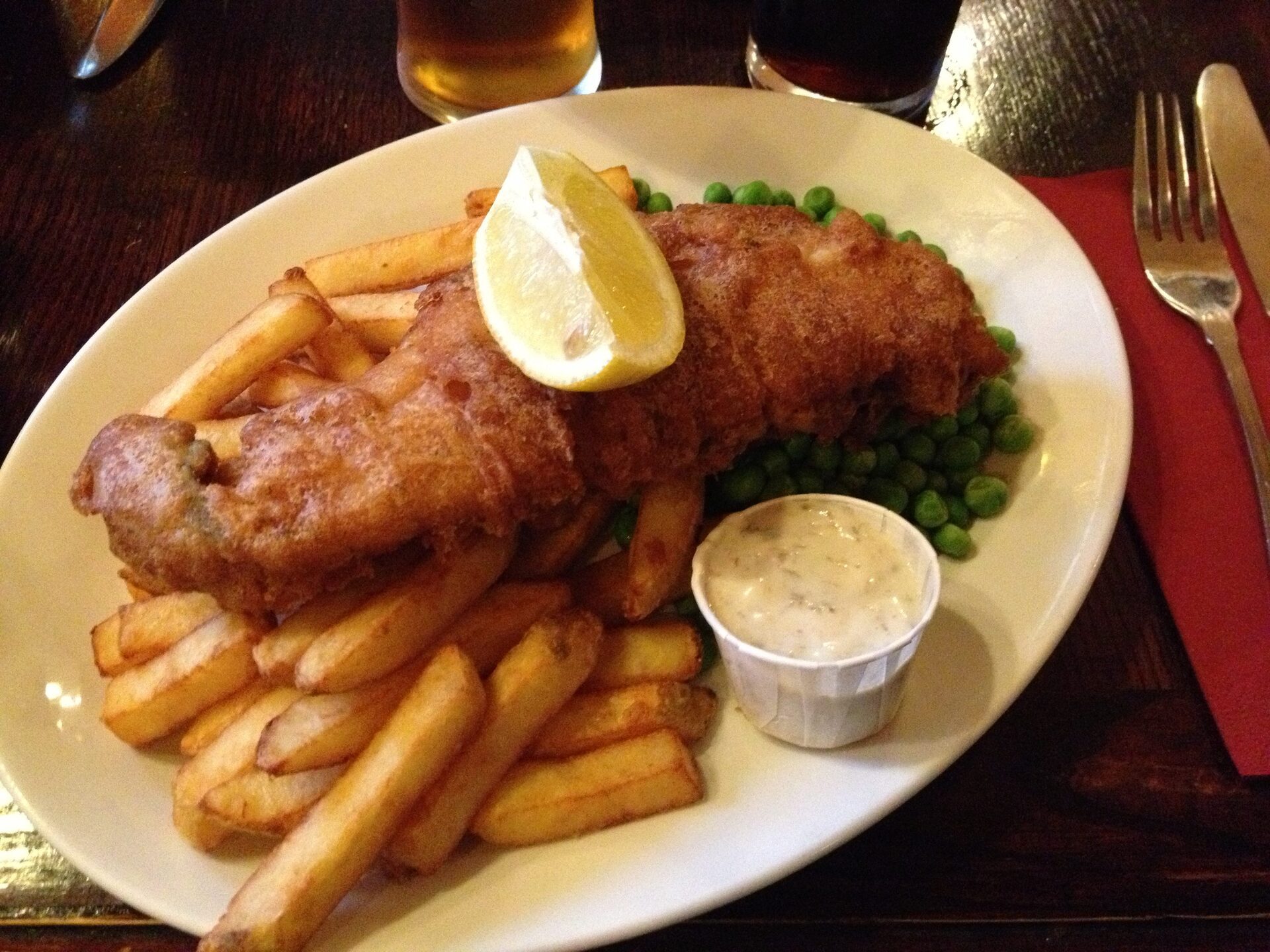 Mangiare fish and chips dietro il Big Ben a The Red Lion