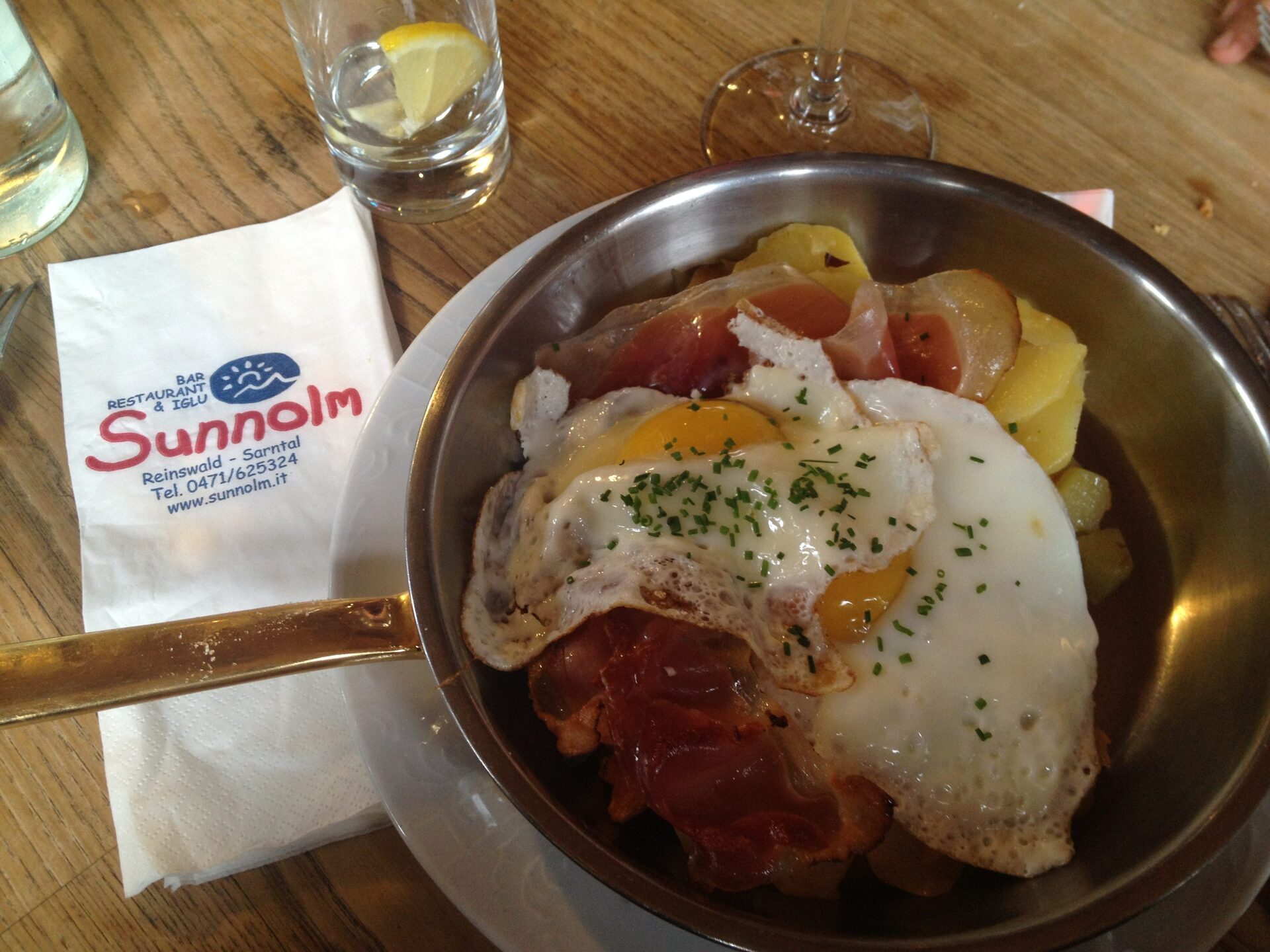 Tralasciando questo particolare vi suggerisco di fare una puntatina a Sunnolm soprattutto per mangiare. Qui si trovano piatti tipici dell’Alto Adige, scritti ovviamente in tedesco e in italiano. Tra le cose che ho assaggiato io un antipasto misto con speck, salumi, formaggi tipici, cetrioli sott’aceto e tanto pane. Poi mi sono ordinata una bella padella :D di uova, speck e patate e infine come dolce ci siamo presi tutti assieme il Kaiserschmarren, una specie di crepes spezzettata con marmellata, uvetta e fragole. Una delizia.