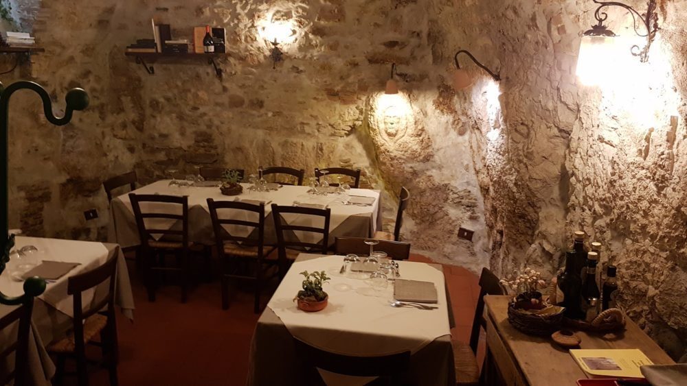 Gli interni, posti a più livelli, sono scavati nell’antichità della roccia su cui si erge il centro storico della città; Il legno, i caminetti, gli arredi tipici di una volta, piccole scalinate, soffitti a volta ed una sala dal soffitto affrescato, regalano un’atmosfera unica; calda; accogliente e a tratti quasi magica.