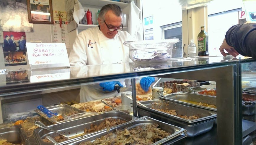 Ogni giorno, nel lato del mercato di Testatccio che si trova dalla parte del Macro, per intenderci, si raduna una gran fila. Persone in attesa che il loro numerino arrivi, che si fanno largo tra la folla per vedere le specialità del giorno. Qui, in questo spazio nemmeno troppo grande lavorano tre persone. Stiamo parlando di Sergio Esposito, il figlio e la moglie, che al box numero 15 del mercato coperto ogni giorno fanno magie.