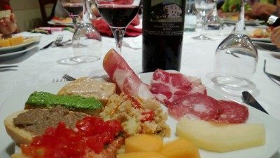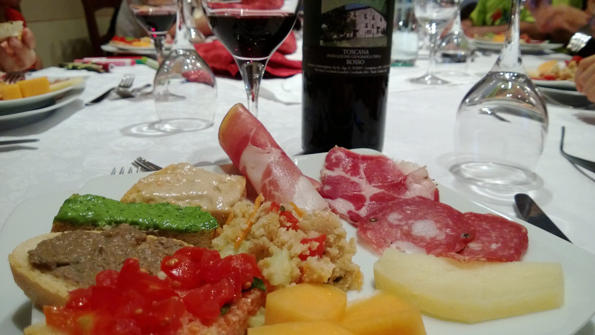Ci portano subito del vino toscano da tutto pasto e degli antipasti ben ‘ordinati’ e colorati che mi han fatto ben sperare. Il menù poi prevedeva una lasagnetta e dei strozzapreti, una tagliata e del coniglio in porchetta, ed il dolce. A leggerlo l’impressione era di dover mangiare fino a scoppiare invece non è andata così.