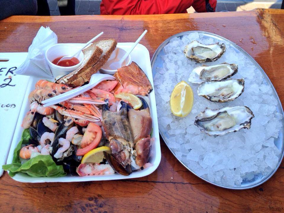 Il menù è su una lavagnetta e i piatti per due, sia piccoli che grandi, vengono proposti un po’ come offerte. Un piatto piccolo per due di frutti di mare viene 12.50£, mentre quello grande viene 25£. Io ho preso il piatto piccolo per due, ma solo perché avevo molto fame e volevo mangiare subito, se solo avessi avuto un po’ di pazienza avrei potuto ordinare tramezzini con salsa di gamberi, cozze calde e tante altre piccole porzioni. Oltre al piatto ho anche preso 4 ostriche.