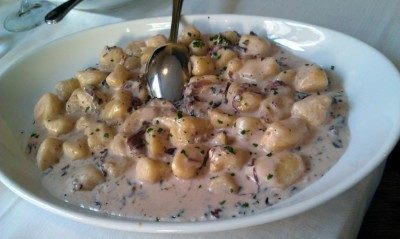 Continuiamo ordinando chi il misto alla griglia dell’Osteria – pancetta, castrato, salsiccia e braciola – con contorno di patate arrosto e verza con pancetta, chi la pizza – vogliamo parlare della “Bulli”: pomodoro, bufala, puzzone di Moena e culatello di Zibello? o della “Gabena”: mozzarella, carciofi al tegame, verza stufata, erbe di campagna, broccoli? (i nomi delle pizze sono un omaggio ai vecchi abitanti del borgo), bevendo sangiovese di Mancini 2011.