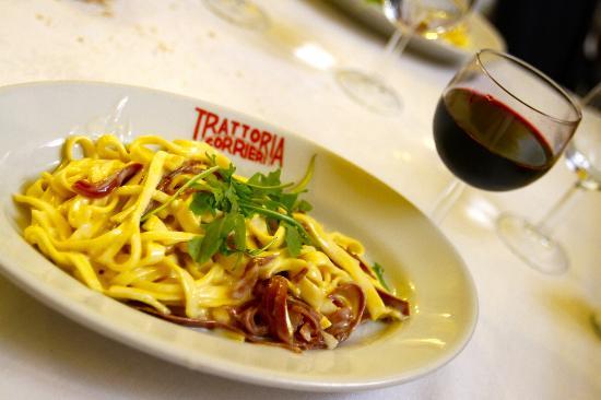 Tra i primi la trattoria propone una scelta ampia di tortelli, cappelletti e gnocchi. Grandissima richiesta ha il Tris di tortelli. Tre colori diversi per tre ripieni speciali: erbette, zucca e ricotta e spinaci. Conditi con burro e parmigiano sono serviti come un tricolore e sono un tripudio di freschezza, originalità e semplicità insieme. Assolutamente da provare! E una volta servito il piatto di ravioli potrete spolverarlo di parmigiano grattugiato direttamente da un originalissimo porta formaggio, una piccola e fedele riproduzione di una piccola forma di parmigiano in ceramica.