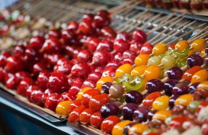 Dolcissimi, coloratissimi ed invitanti, sono degli spiedini di frutta caramellata, in vendita in strada un po’ ovunque a Pechino. Spesso lo spiedino, molto alto, è composto da sole fragole rosse e grandi, tutte ricoperte da una spessa glassa di zucchero. Ma si trova anche di frutta mista. Visti insieme sono davvero colorati e mettono voglia di essere mangiati, tornando un po’ bambini con le mani sporche di zucchero e le labbra tutte da leccare. Anche questo cibo di strada è molto economico, di solito 10 yuen a spiedino (1 euro circa).