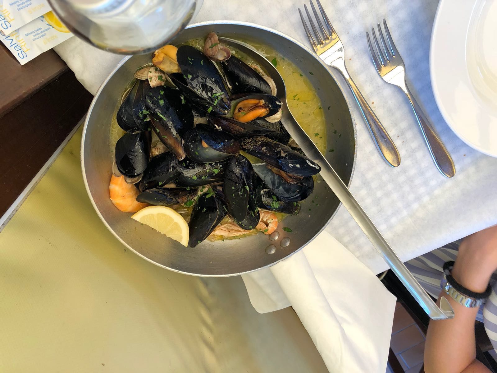 Quando siamo arrivati la fame si faceva sentire quindi, consultando l’ampio menù, abbiamo deciso di ordinare un antipasto misto caldo, da dividere a metà, e due piatti di spaghetti allo scoglio bianchi con crostacei.
