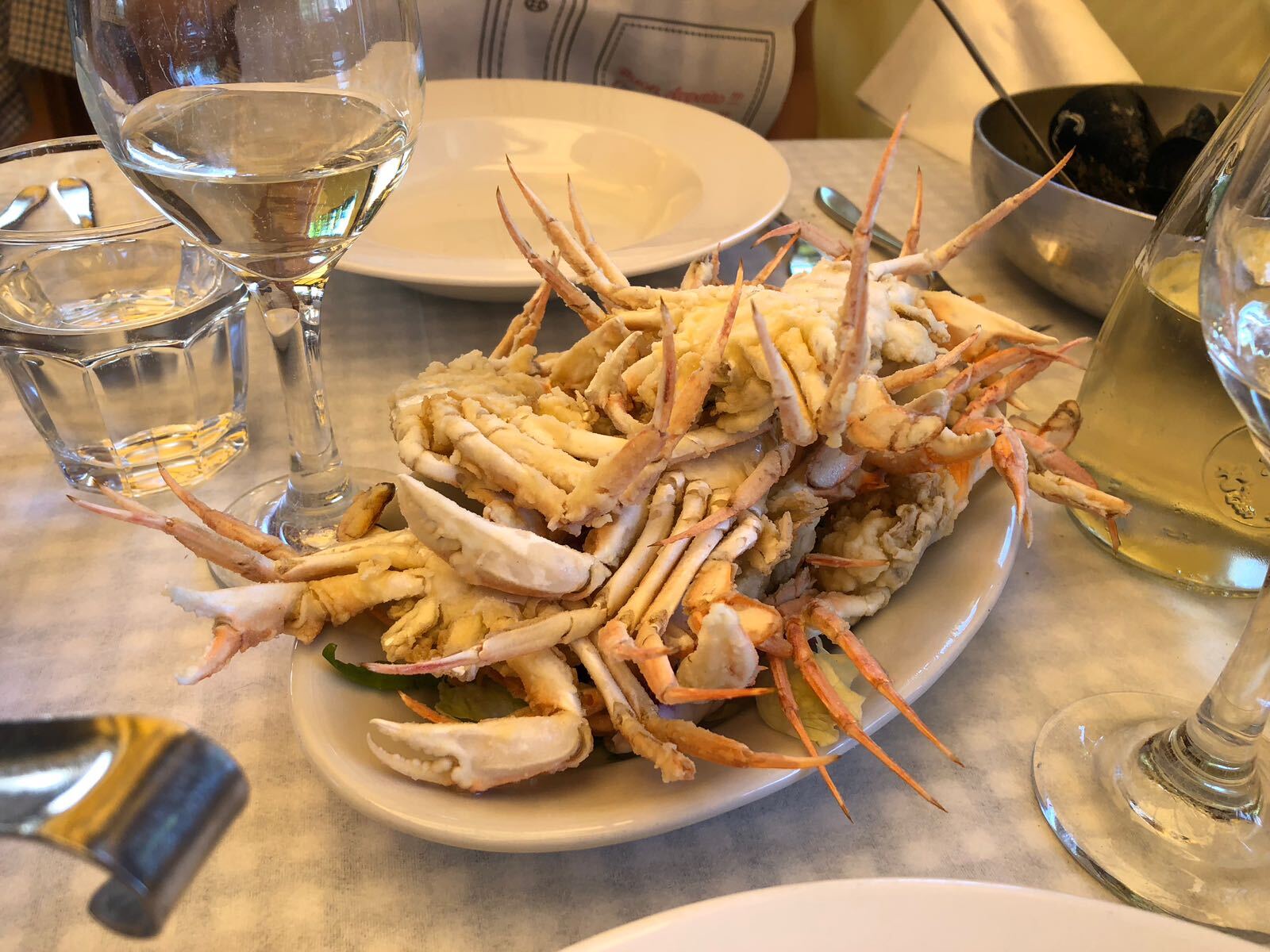 L’antipasto misto caldo, che per loro era una porzione per uno, includeva sauté di cozze e vongole, canocchie al vapore e tanti, ma tanti, granchietti interi fritti con una frittura che li rendeva super fragranti e faceva si che potessi mangiarne ogni parte, senza lasciare proprio nulla.