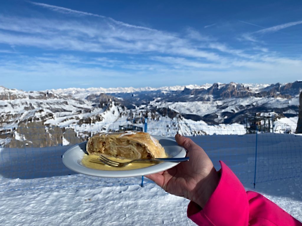 Lo strudel è il dolce più conosciuto delle Dolomiti, quello che tutti preparano e offrono quando arriva qualcuno. Lo strudel è così famoso che ormai viene preparato in tutta la Penisola, ma è qui che nasce ed è una vera goduria poterlo assaggiare mentre si è in un rifugio, dopo una bella ciaspolata ma anche così, per concedersi un dolce. Lo strudel di mele è un classico, fatto con mele appunto ma anche pinoli, uvetta e cannella può essere accompagnato da una salsa alla crema o da panna montana, in base a dove viene servito.