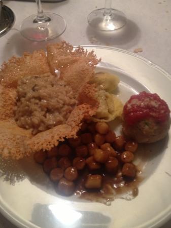 E’ così quindi che nella scelta tra 4 splendidi e invitanti primi piatti (canederli, risotto ai porcini e tartufo, strangolapreti agli spinaci e ravioli al radicchio e speck) mi lascio convincere, con successiva mia grande soddisfazione, a prendere il piatto degustazione, un poker di tutti e 4 i primi, per non perdersene nessuno! E sarebbe stato un delitto.