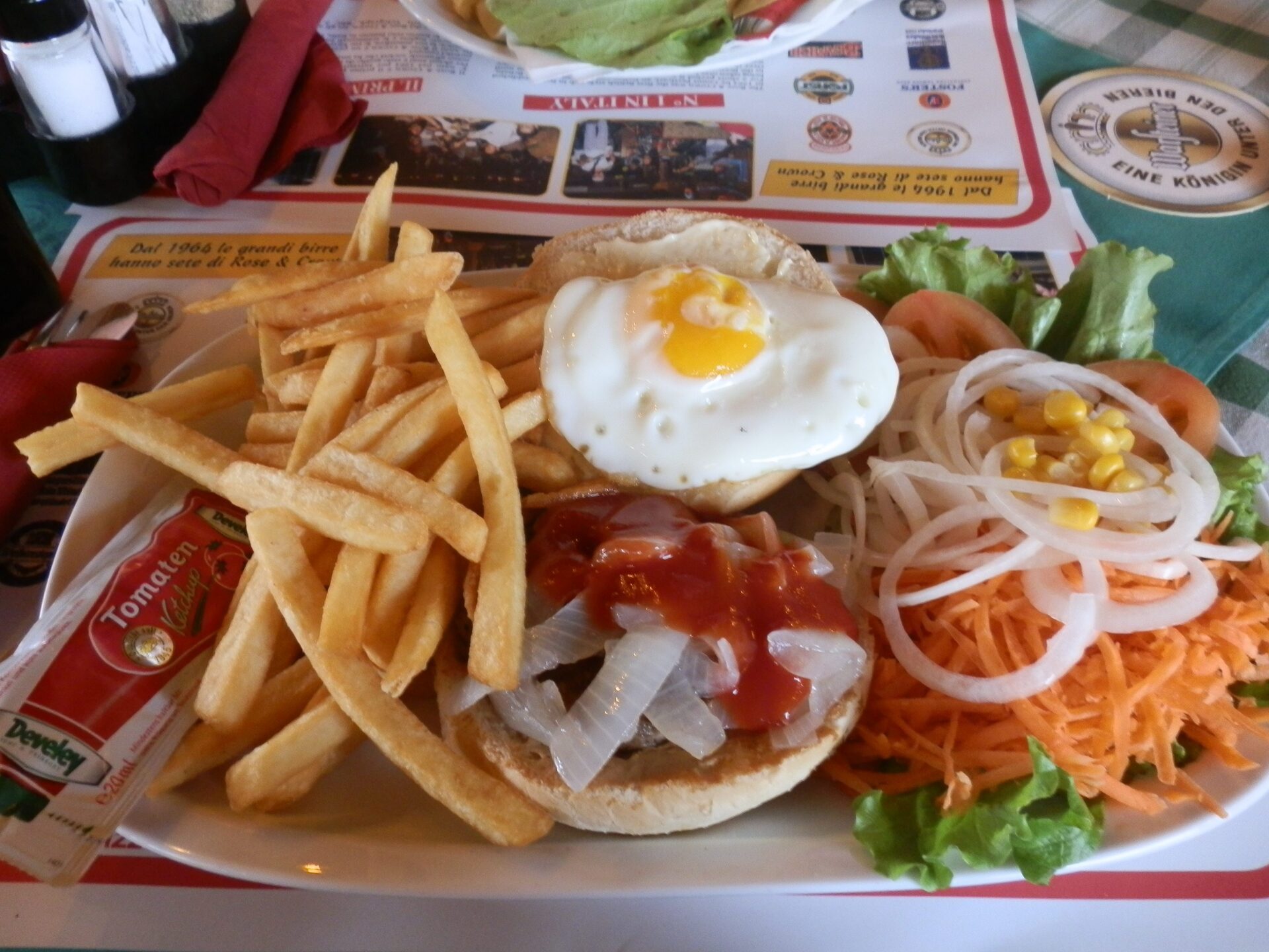 Parlando del menù, (mi spiace per voi, ma vi farò venire l’acquolina) si va dalle più classiche patatine fritte, sia per una persona ma anche per 4, il piatto uova pancetta e patatine, hot dog, hot dog piccante, hamburger con formaggio e insalata, doppio hamburger e hamburger super guarnito….giusto per dare un’occhiata ai piatti più classici.