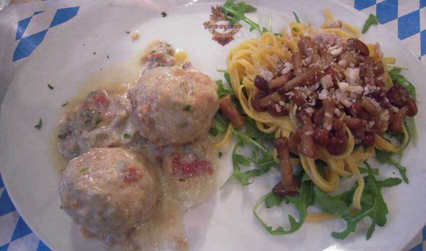 Anche il cibo è in perfetto stile tedesco ed austriaco: dai canederli con gorgonzola (deliziosi), al goulash di manzo, dalle salsicce originali austriache e tedesche con gli immancabili crauti, per arrivare alla famosa sacher o al kaiserschmarren (delle crepes spezzettate e falmbé).