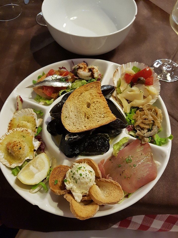 Di altro tenore la proposta per la sera, cioé il Buffet Da Angelina in via Cadorna (non lontano dal Molo dei Bersaglieri). Nonostante il nome “popolare” si tratta di un ristorante arredato con gusto e con una carta molto interessante. Il pezzo forte del menù è il ricchissimo antipasto, servito in un grande piatto a scomparti, ogni scomparto una delizia, dalle cozze alle capesante, dai crostini al baccalà mantecato- immancabili qui a Trieste ma veramente deliziosi – all’insalata di mare e alle sarde marinate.