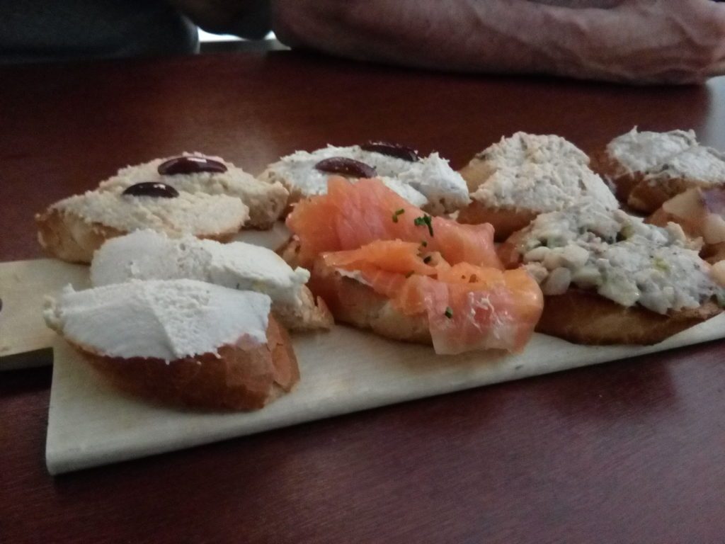I crostini erano veramente squisiti: con salmone affumicato, con baccalà mantecato, con tonno fresco, con patè di pesce, tutto spalmato su pane tostato e croccante. In abbinamento avevo preso un spritz triestino: qui si deve fare una precisazione, per non rimanere delusi. Spritz (in tedesco spruzzare) da queste parti è sinonimo di vino bianco freddo miscelato ad acqua gasata, con o senza fettina di limone. Molto leggero, molto dissetante, ma nemmeno lontanamente simile dell’aperitivo a base di Aperol che siamo abituati a consumare ovunque.
