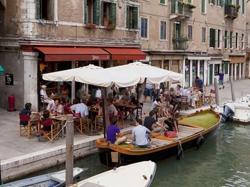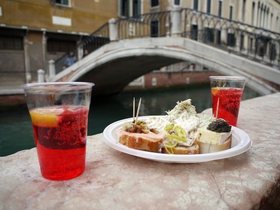 I locali passano da un bacaro a un altro assaggiando cicchetti e bevendo ombre de vin. C’è chi vanta di farne sette di fila, ma due a sera sono comunque un ottimo risultato perché il punto non è né bere né mangiare, ma “fare do ciacole” in calle o in campo.