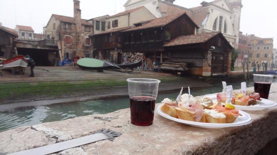 Fondamenta Ormesini: si sta più fuori che dentro e si possono prendere fino a 5 cicchetti a testa che cambiano a seconda della stagione, passando da gorgonzola e fragola a taleggio e fico. Ci sono poi i classici, come il crostino con baccalà o con salumi vari.