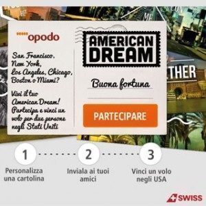 In palio appunto un volo di A/R in classe economica per gli Stati Uniti, valido per due persone, offerto dalla compagnia aerea Swiss. Il vincitore, potrà decidere quale parte dell’America scoprire, scegliendo la destinazione d’arrivo tra: Boston, Chicago, Los Angeles, Miami, New York e San Francisco. La partenza potrà avvenire da una delle seguenti città: Milano, Roma, Firenze e Venezia.