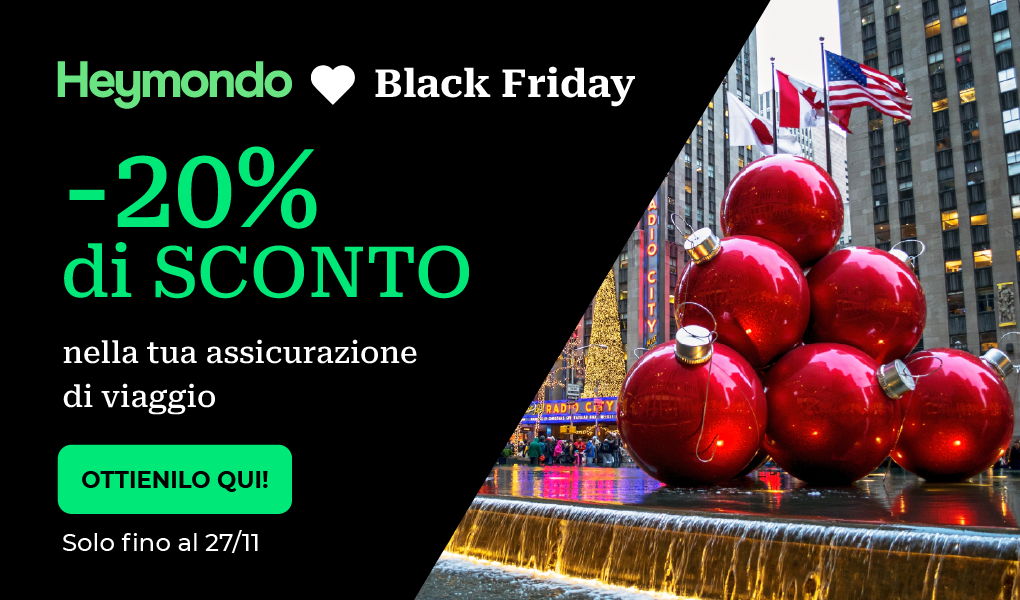 Una volta prenotati i voli e gli alloggi, cos’altro ti rimane da fare? Non moltissimo, il grosso è fatto, è vero. C’è una cosa però che ti consiglio vivamente di fare, è l’assicurazione viaggio Heymondo. Già, anche Heymondo in occasione del Black Friday offre un bello sconto del 20% a tutti i clienti. Dal 20 al 27 novembre (entrambi inclusi), basta accedere al sito di Heymondo attraverso questo link e troverai il messaggio 20% BLACK FRIDAY e non devi fare altro per avere lo sconto, lo troverai infatti già inserito nel carrello alla fine dell’operazione, al momento del pagamento.