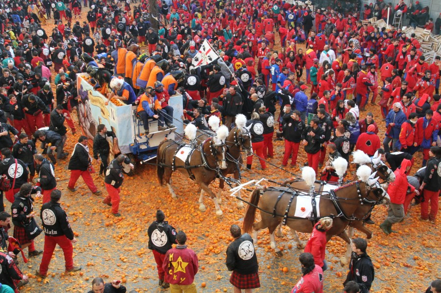 La battaglia delle arance è, dunque, uno dei momenti più importanti del Carnevale di Ivrea, spesso l’unico noto e, come detto, ripercorre simbolicamente il momento della ribellione della città di Ivrea nei confronti della tirannia della città. Ogni anno ciascuna comunità, identificata dall’appartenenza a definiti confini rionali, cerca di affermare la propria superiorità sulle altre in 3 giorni di grande impegno e coinvolgimento.