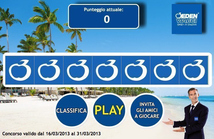 Per partecipare è sufficiente effettuare il log-in su Facebook e giocare con la slot per accumulare 10mila punti, invitando anche altri amici. Ogni due settimane, per la durata complessiva di sette mesi, Eden Viaggi premierà un utente con una vacanza di una settimana all inclusive, soggiorno per due persone in una destinazione in Italia, per un totale di 14 soggiorni premio.