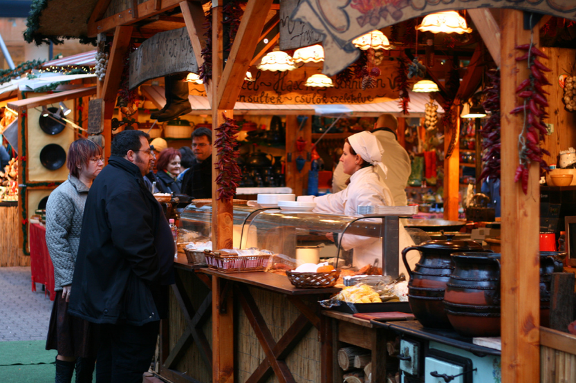 Ci si può riscaldare con una zuppa calda o un gulash accompagnato dal kenyérlangos, un pane cotto in forno d’argilla. Fare uno spuntino con un làngos farcito o un hot-dog farcito con le buonissime salsicce di maiale ungherese. Oppure pranzare e cenare con carne alla griglia, pesce fritto e tanti altri piatti particolari. Chi preferisce il dolce non può rimanere di sicuro a bocca asciutta perché può assaggiare golosità natalizie come i bejgli, dolci tipici con semi di papavero, noci o uvetta. Anche il rétes, lo strudel ungherese, i golosissimi kürtőskalács. Per accompagnare tutto non può mancare il vin brulè.