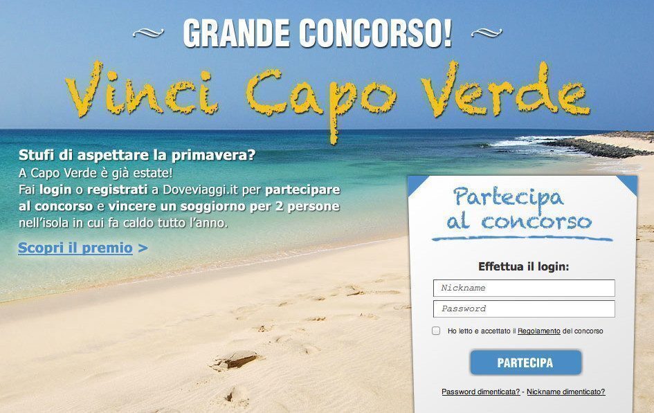 Questo è un concorso che piacerà a tanti! Non solo a chi è davvero stanco di aspettare la primavera in questo lunghissimo inverno che pare interminabile, ma anche a chi vorrebbe fare un salto a Capo Verde. Allora tentar non nuoce, mal che vada avrete buttato via qualche minuto della vostra giornata, ma se vi va bene, eh, se vi va bene non dimenticate di mandarci una cartolina per farci morire d’invidia! :)
